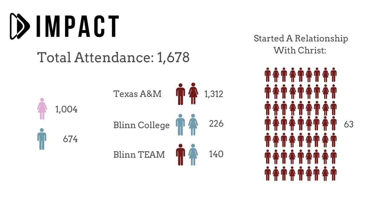 We are thankful for the time with the freshmen this August and have successfully been able to help connect freshmen to the Body of Christ at Texas A&M and Blinn. Now, we are more than excited to get started to prepare for what the Lord has in store for Impact 2019!